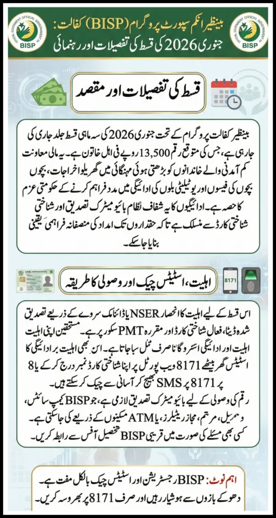 According to recent payment patterns and inflation adjustments, the expected Kafalat installment for January 2026 is: Rs. 13,500 per eligible woman This amount is part of the quarterly support system. If the government announces any increase or special relief, BISP will officially notify beneficiaries before distribution.