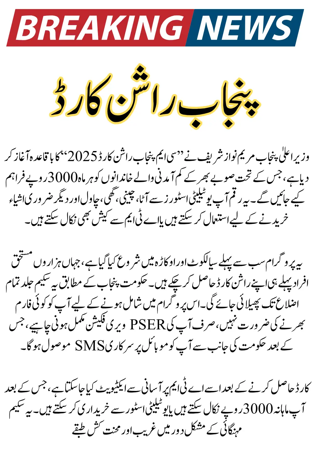 The CM Punjab Ration Card 2025 is a major step toward reducing the burden of inflation on low-income families. With Rs 3,000 monthly assistance, families can buy essential groceries or withdraw cash when needed. If your PSER details are complete, keep your phone active and wait for the official SMS from the Punjab Government.