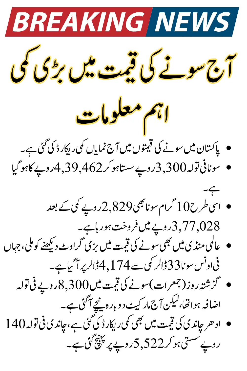 Today’s move is good news for buyers — gold per tola is Rs 439,462, down by Rs 3,300 — thanks to a global decline of $33/oz. However, remember gold markets are volatile; check live local rates and consider your investment horizon before making decisions.