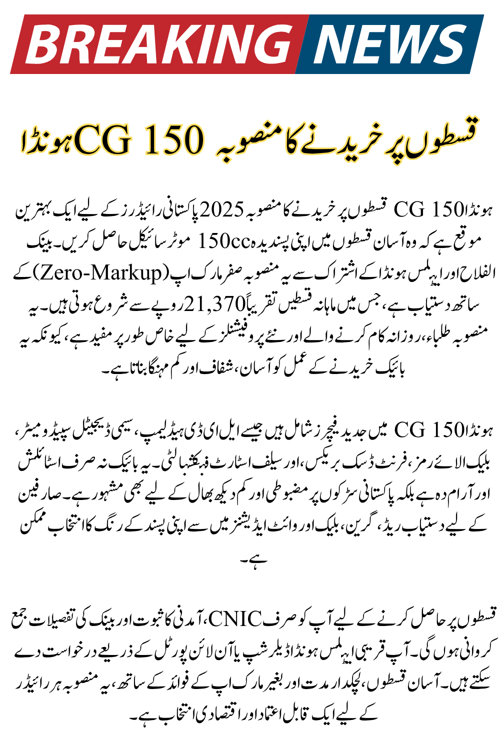 Owning a Honda CG 150 has never been easier for Pakistani riders in 2026. With the zero-markup installment plan offered by Bank Alfalah in partnership with Atlas Honda, you can bring home a reliable 150cc bike without straining your budget. Starting monthly payments from around Rs. 21,370, this plan is perfect for students, daily commuters, and entry-level professionals looking for a stylish, durable, and fuel-efficient ride.