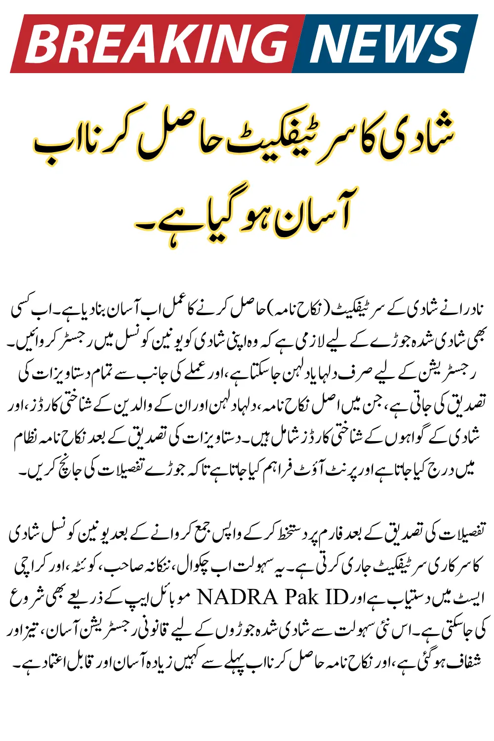 Good news for married couples in Pakistan! NADRA has simplified the process for obtaining a marriage certificate (Nikah Nama) through Union Councils. Now, couples can easily register their marriage and get an official certificate with fewer hassles. This new procedure ensures transparency, accuracy, and efficiency, making it easier for citizens to comply with legal requirements.