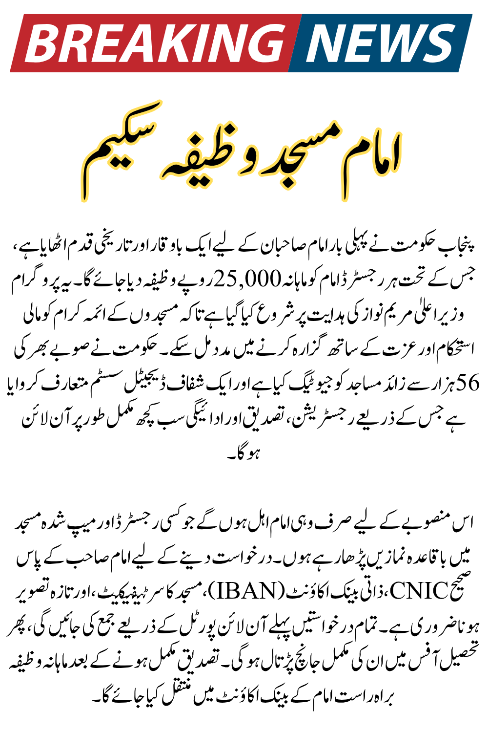 - Be a registered imam working in a mosque in Punjab
