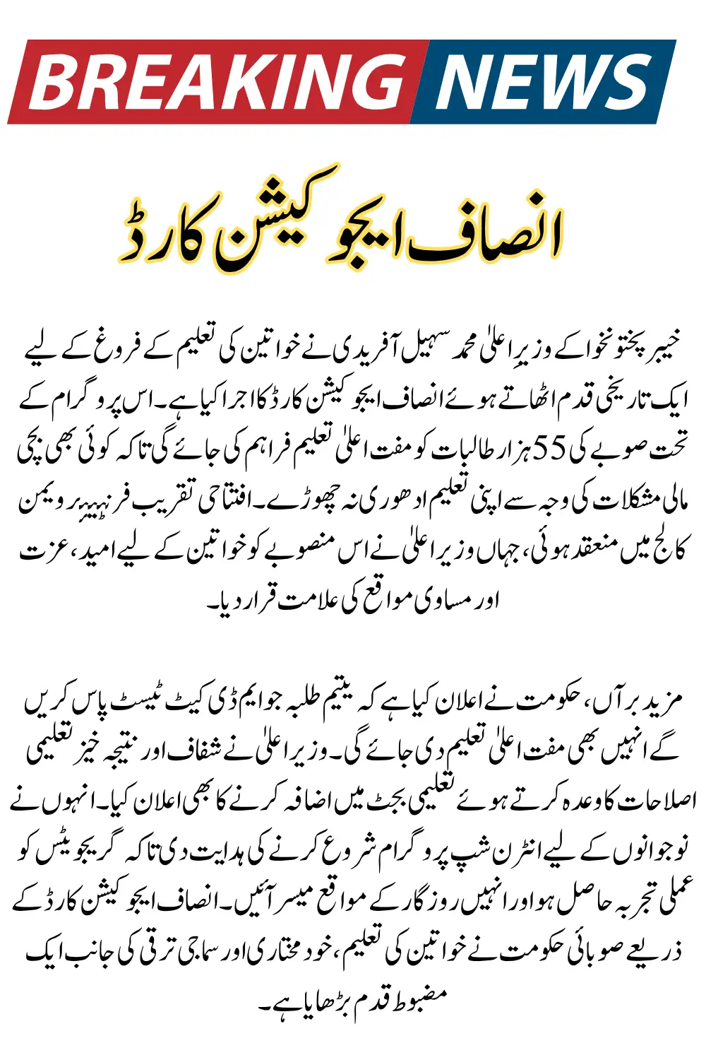 The Insaf Female Education Card is designed to make higher education accessible for every girl in Khyber Pakhtunkhwa, regardless of her financial background. Under this program, the provincial government will cover tuition fees and provide financial support to female students studying in universities and colleges.