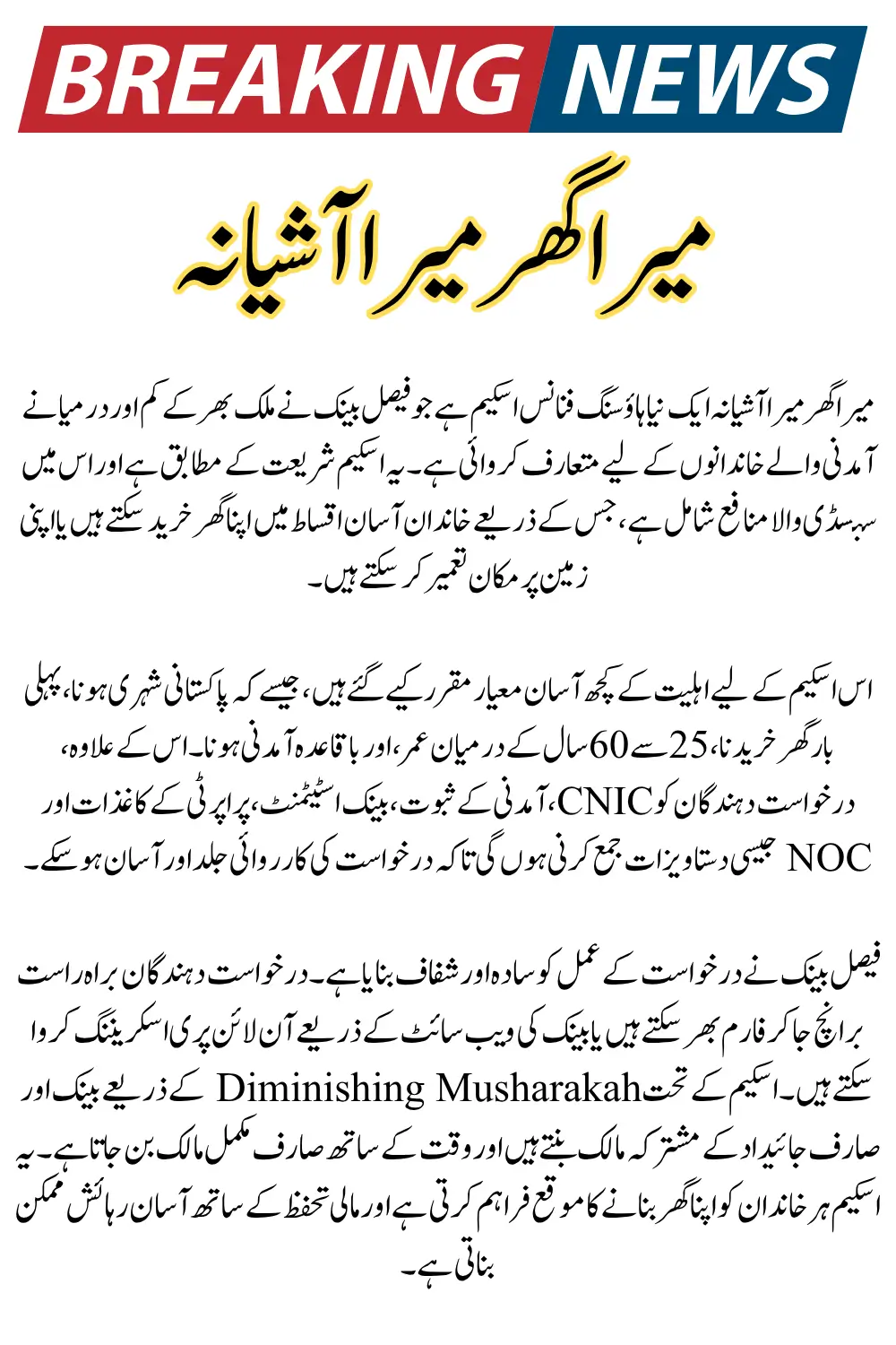 Mera Ghar Mera Ashiana Loan Scheme by Faysal Bank is a major step toward helping low- and middle-income families achieve long-term home ownership. With Shariah-compliant financing, simple eligibility, and subsidized profit rates, the scheme ensures affordable and transparent housing finance.