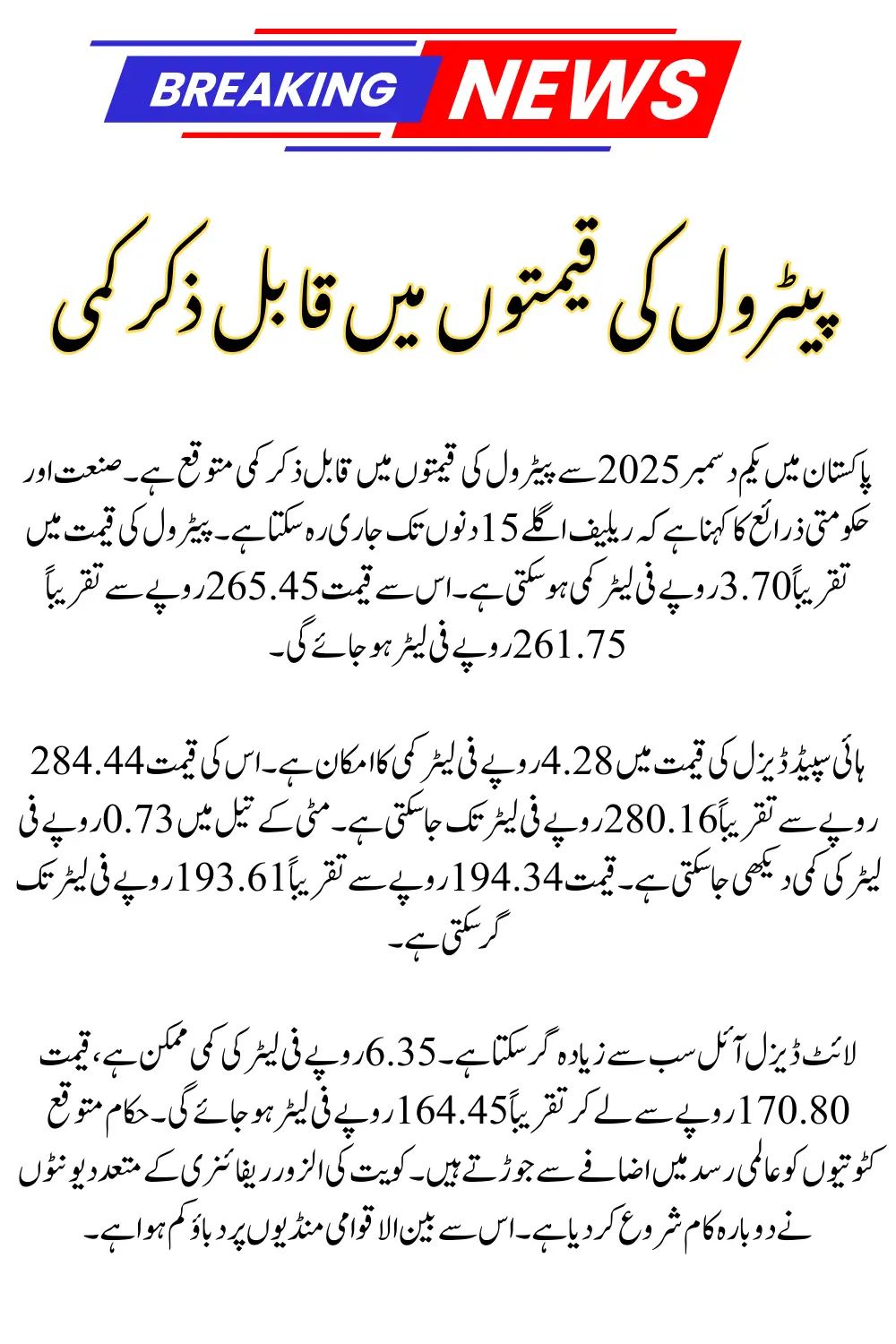 A notable fall in Petrol prices is expected in Pakistan from December 1, 2025. The relief may last for the next 15 days, industry and government sources say.