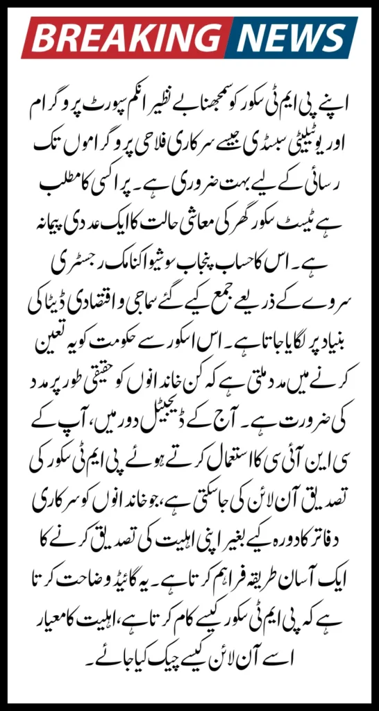 In today’s digital era, PMT score verification can be done online using your CNIC, providing a convenient way for families to confirm their eligibility without visiting government offices. This guide explains how the PMT score works, eligibility criteria, how to check it online, and solutions to common errors.